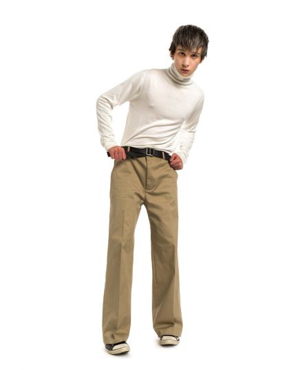 - Pantalone dritto, vita regolare, fondo largo, tasche laterali chino, a filetto con bottone posteriori.